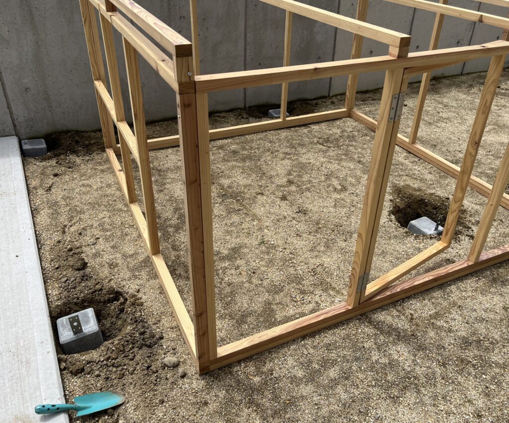 ⑥強風で小屋が動く、急きょ簡易的な基礎を追加、穴掘り