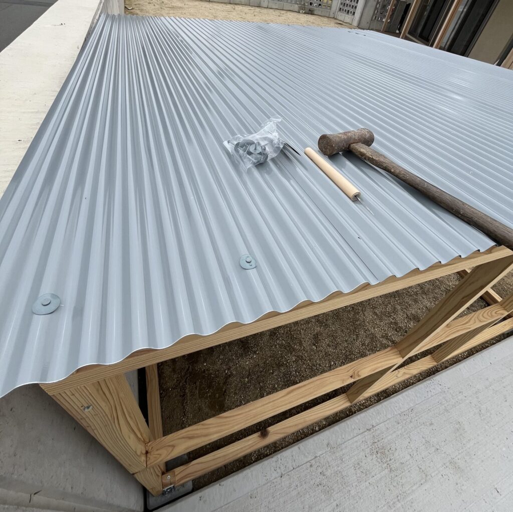 ⑦屋根の取り付け。トタンを固定するため、傘釘をトントン